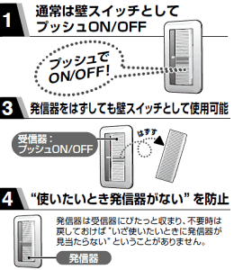 機能紹介 スイッチに取り外しのできるリモコンをビルトインできるので、さらに使いやすくなります。