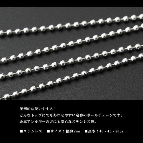 □ 商品詳細 □ 【素材】 ■ステンレス 【仕様】 ■幅:約2mm ■長さ:約40、45、50cm ステンレス製のシンプルなボールチェーンです。